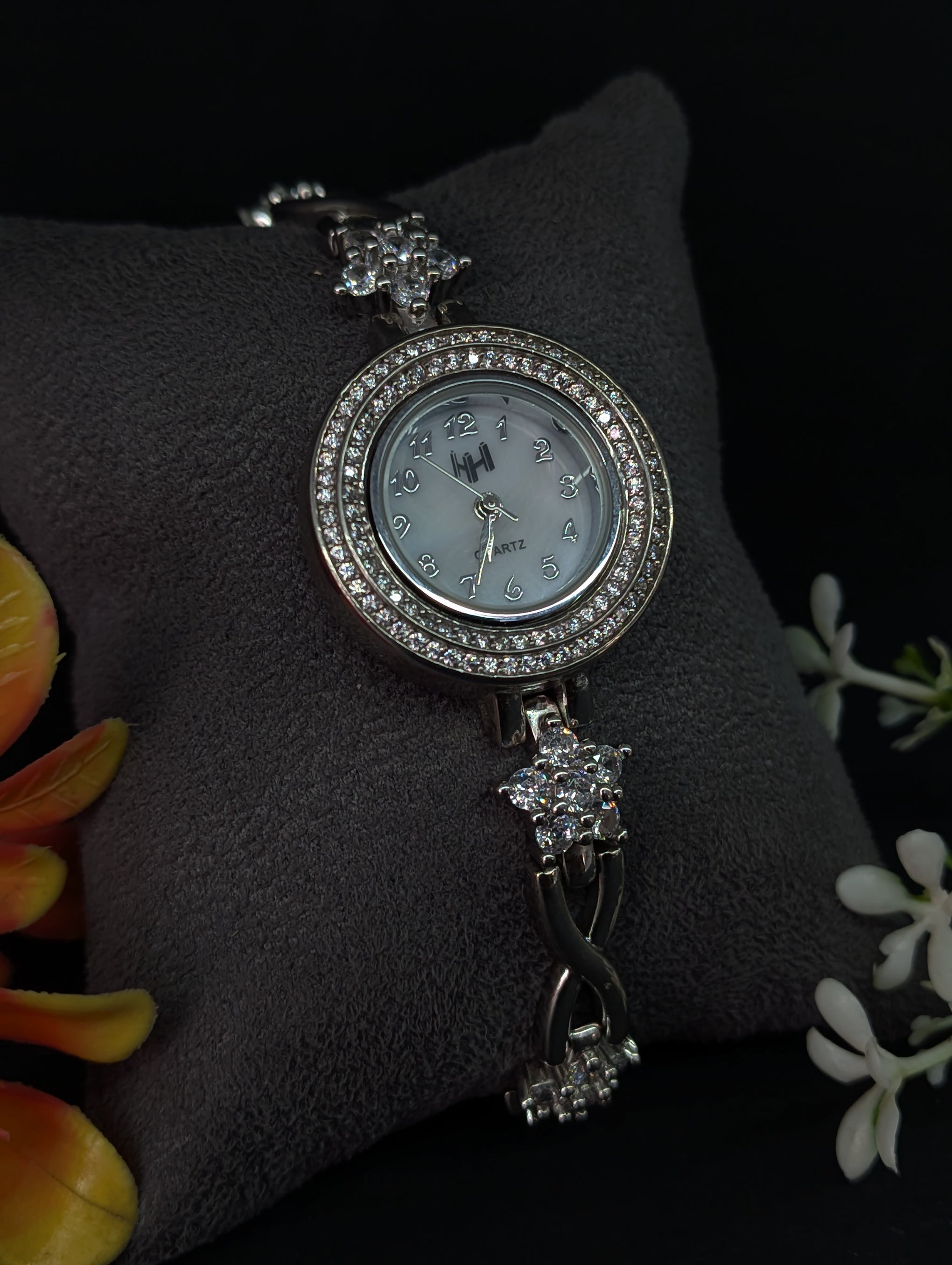 Crystal Halo Bezel: The circular face is surrounded by a halo of precision-cut stones, providing a mirror-like shine and high-end aesthetic.