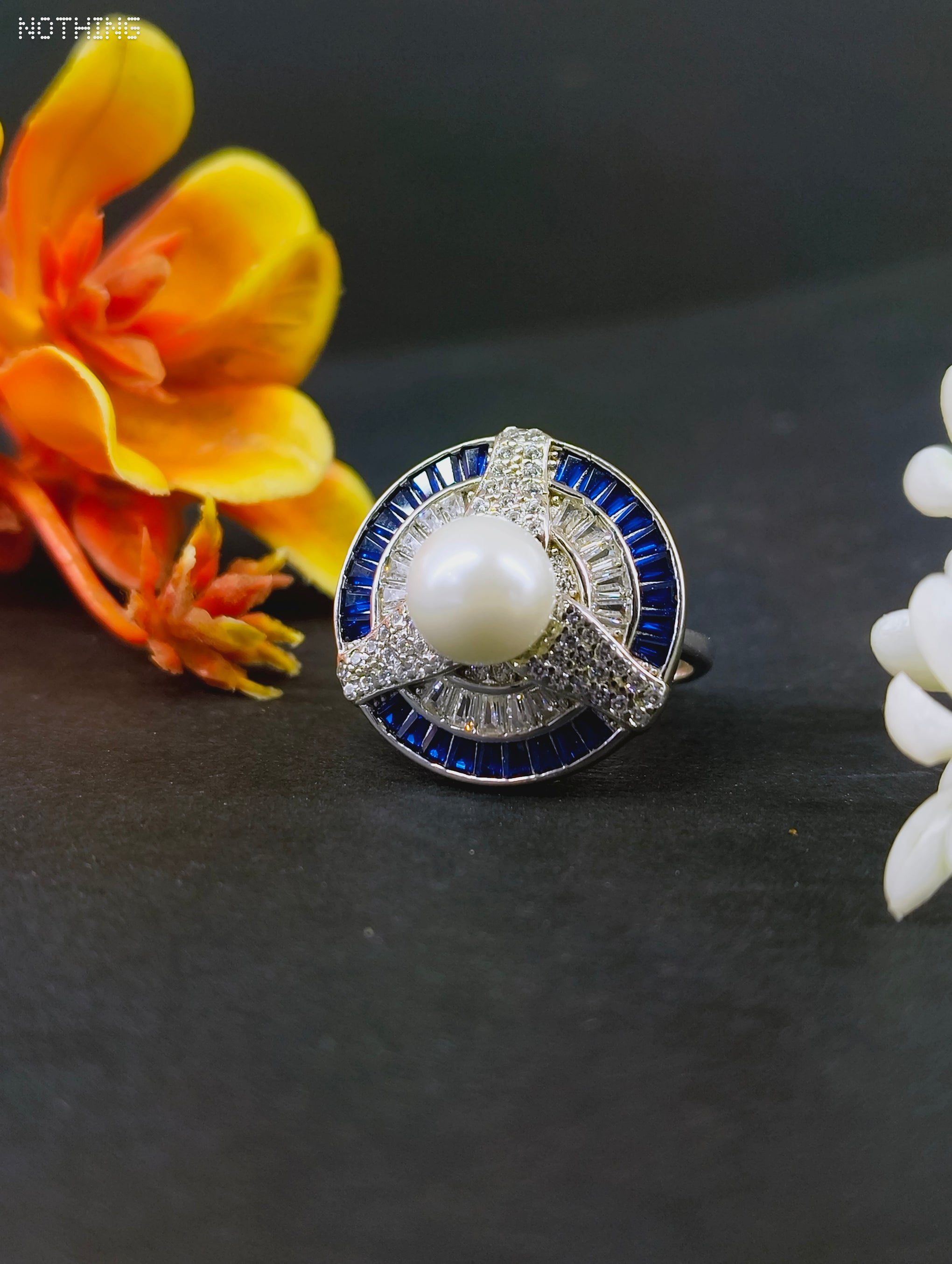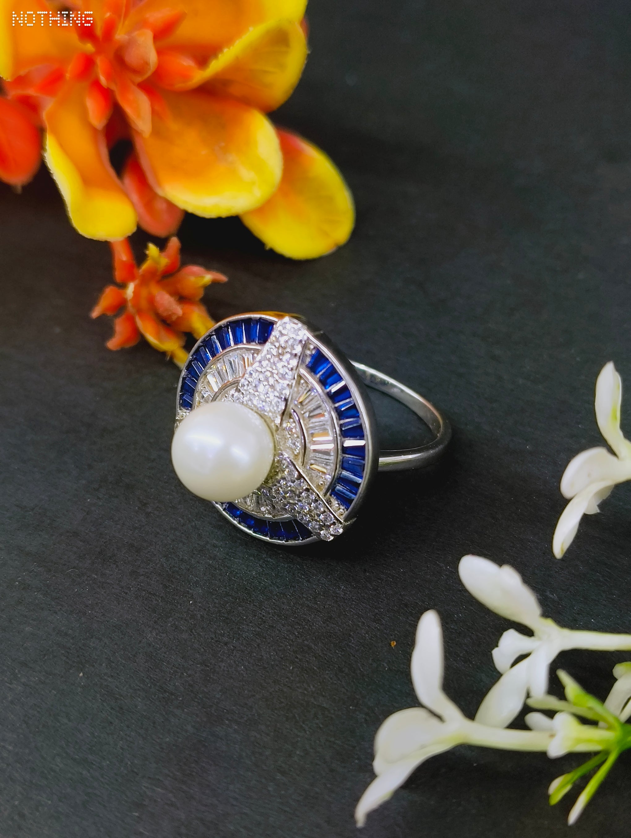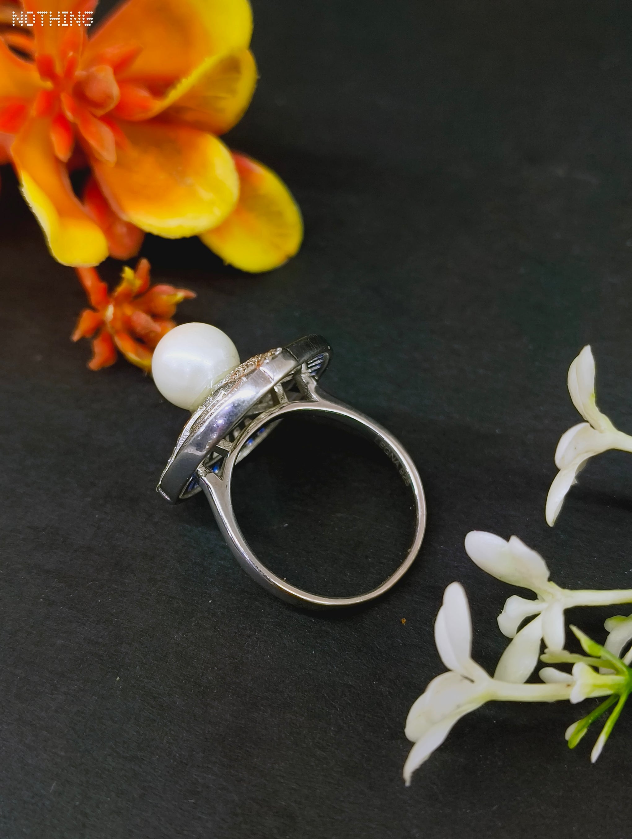 RUKMI 92.5 Sterling Silver Art Deco Pearl & Midnight Blue Statement Ring