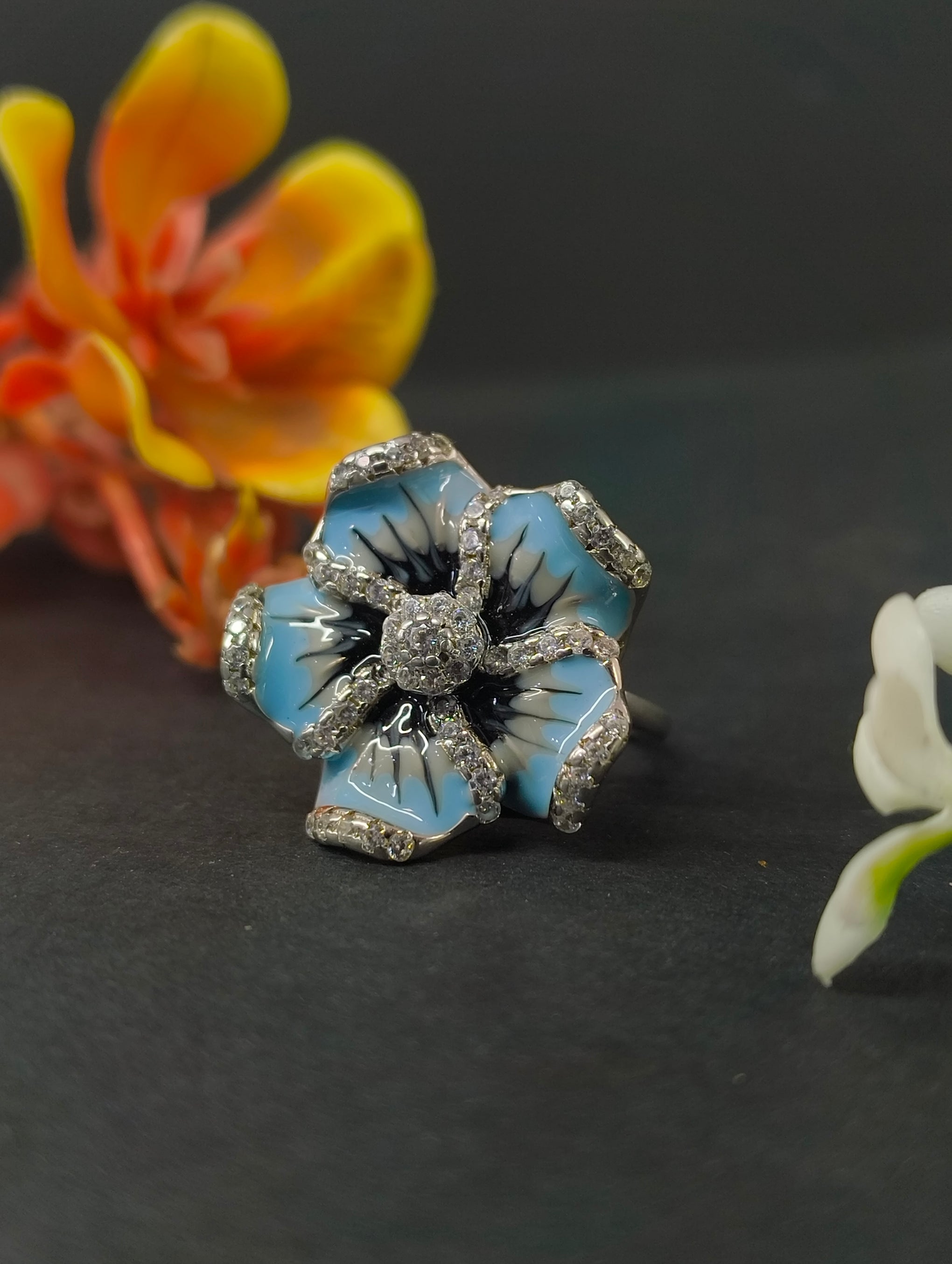 RUKMI 92.5 Sterling Silver "Azure Bloom" Hand-Enameled Statement Ring