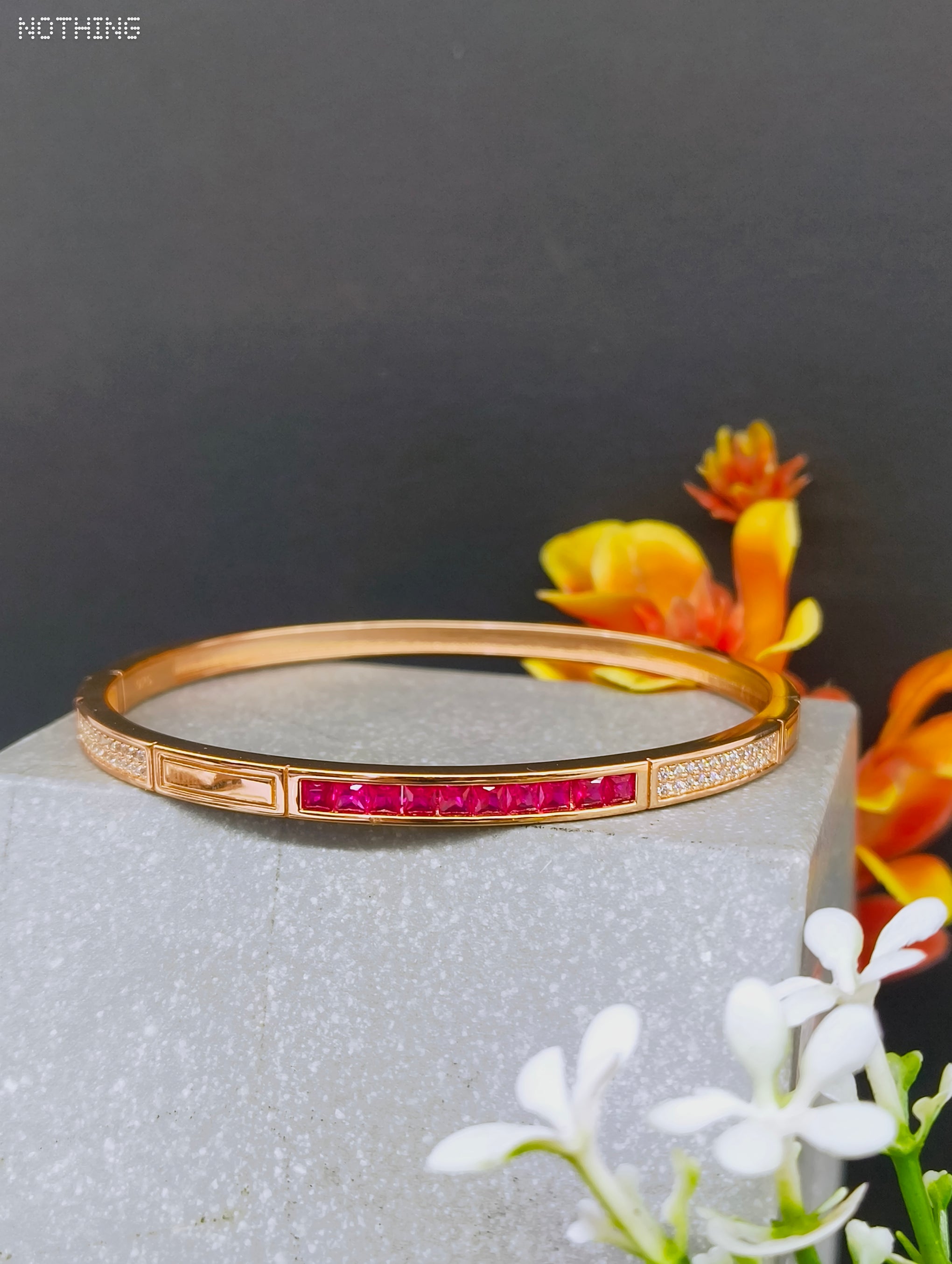 • Vivid Ruby Red Center: Showcases a continuous line of precision princess-cut red stones, offering a bold contrast against the rose gold band.