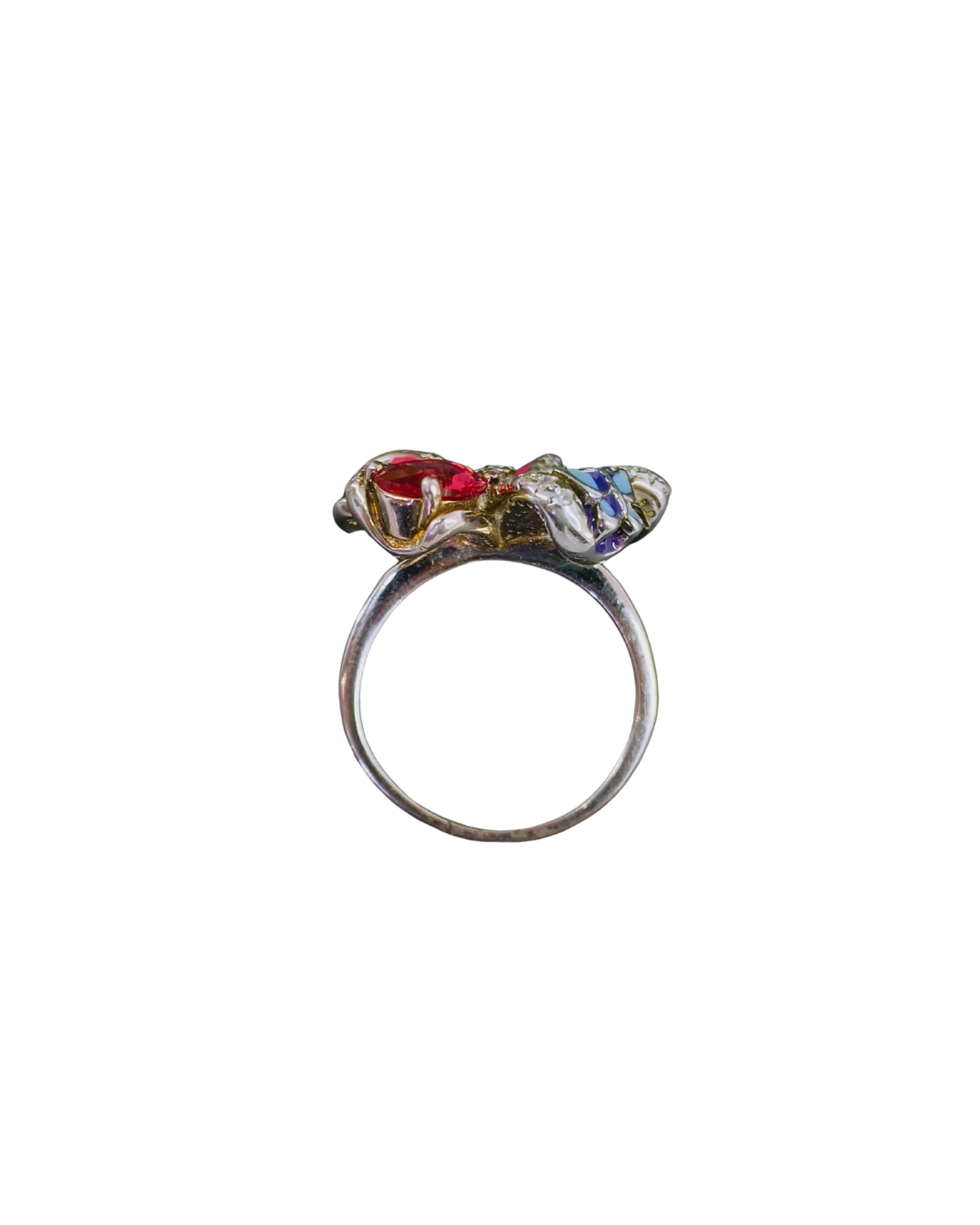 Ruby-Tone Centerpiece: A prominent, vibrant red oval-cut stone serves as the body of the butterfly, adding a regal touch to the whimsical design.