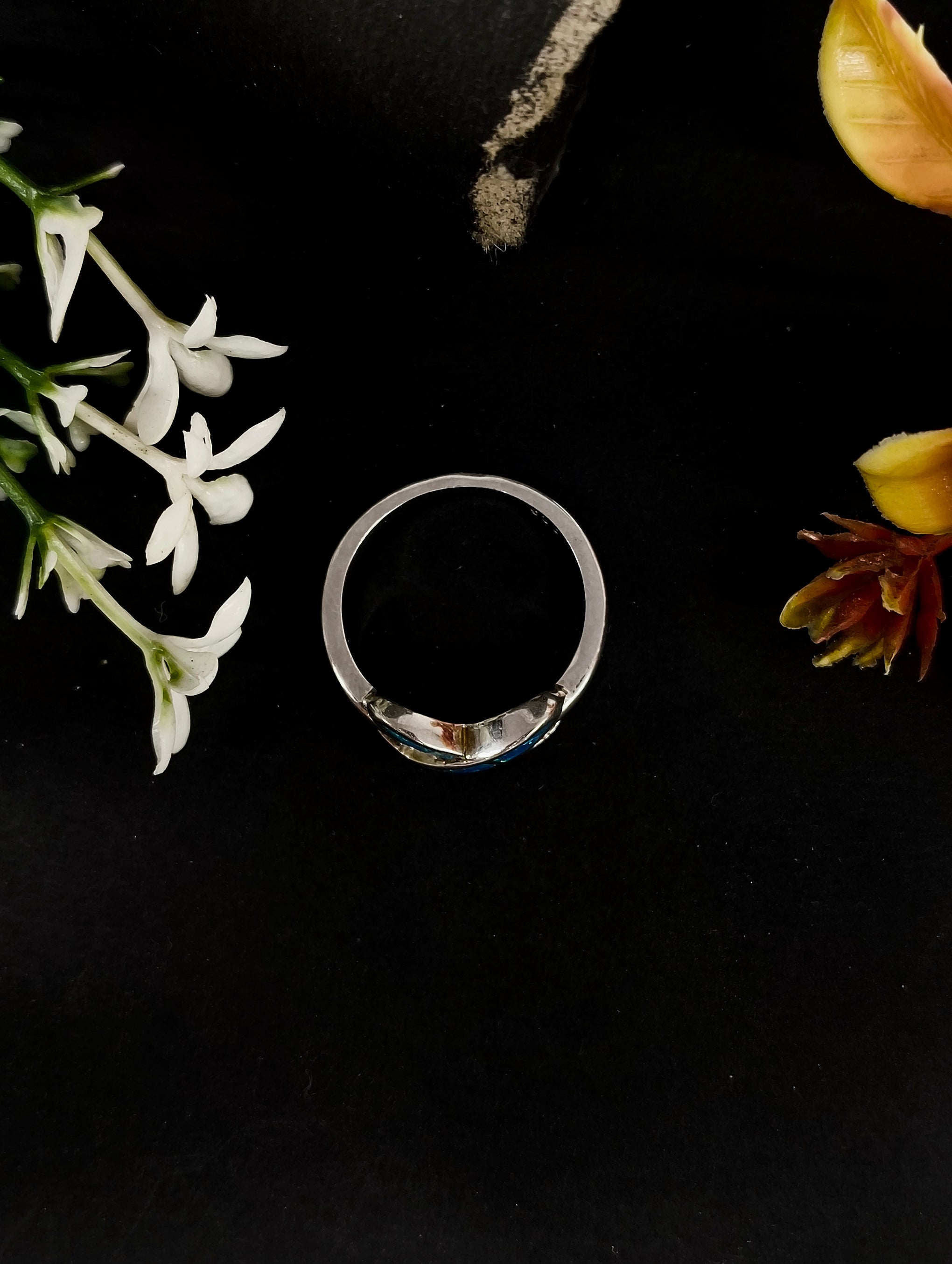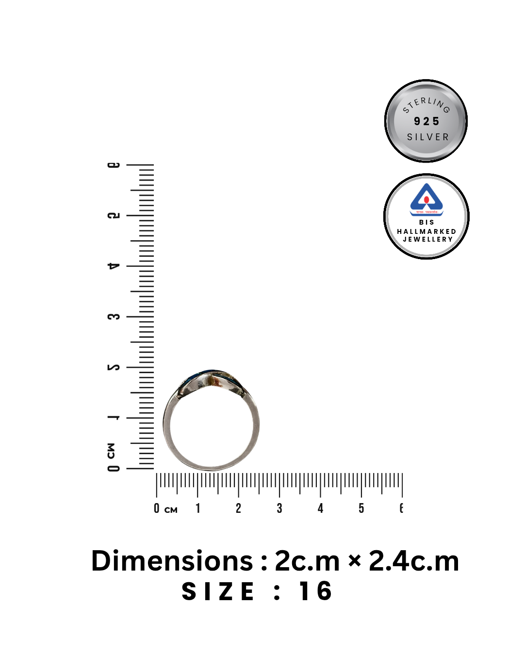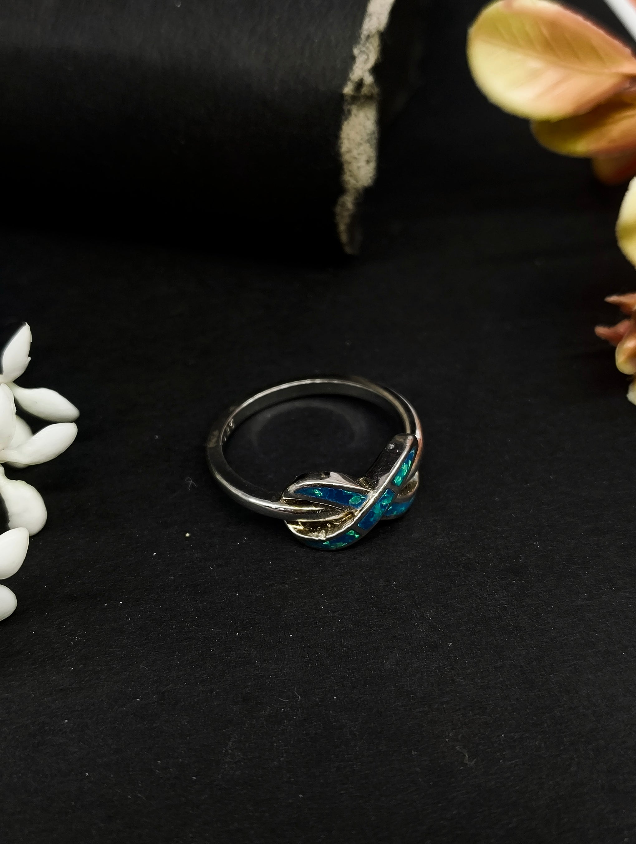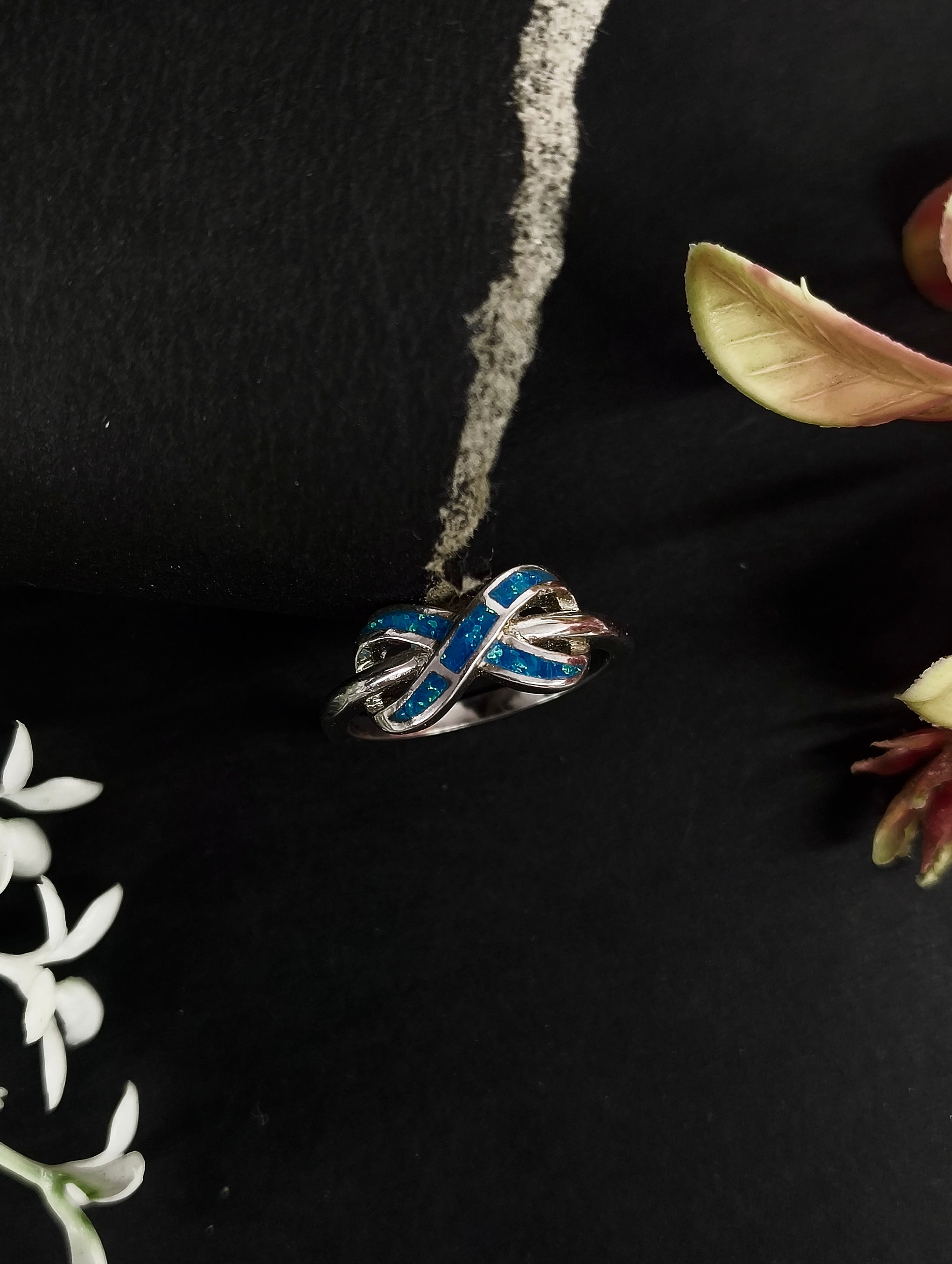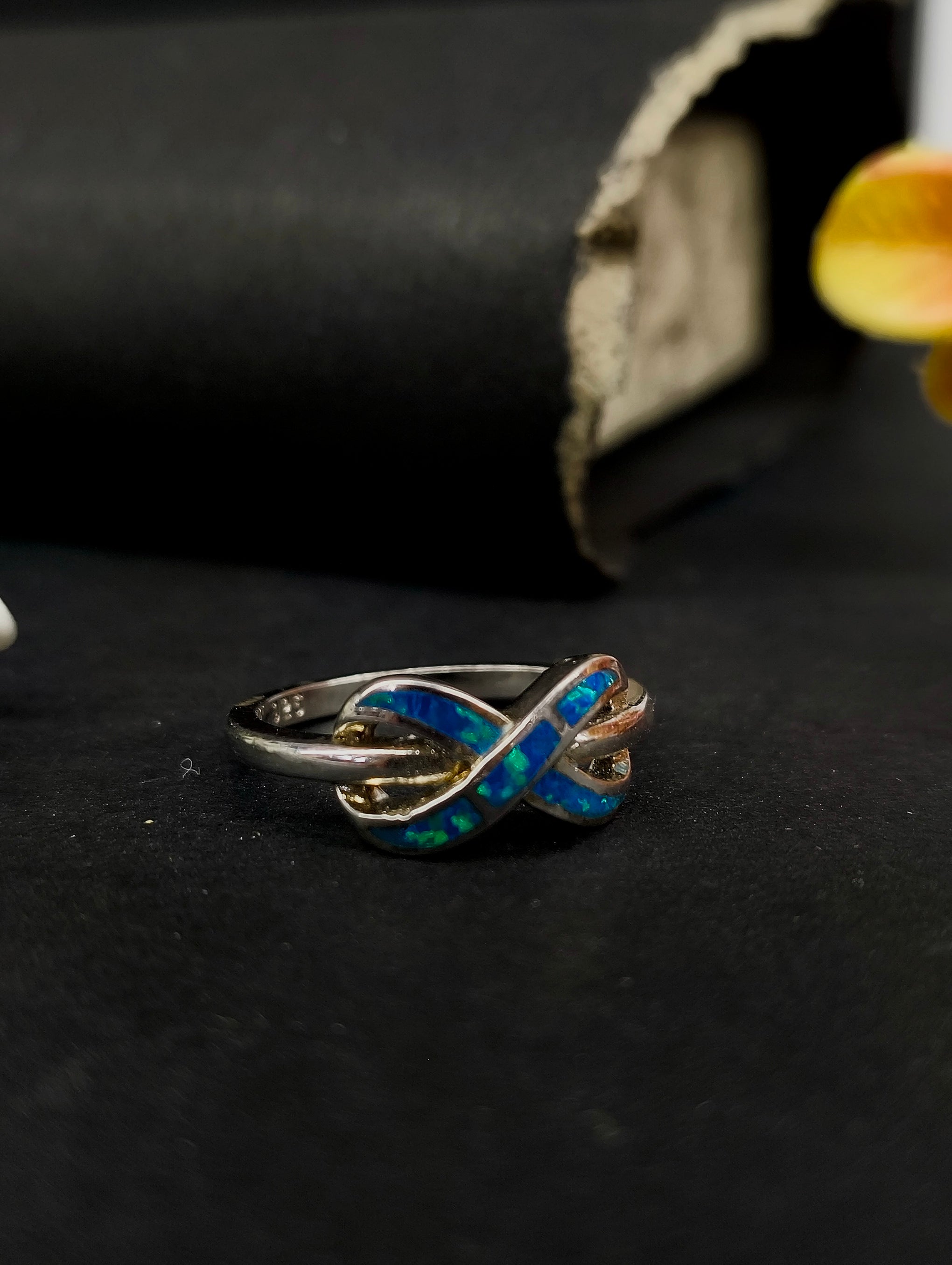 Symbolize your eternal style with the RUKMI Blue Opal Infinity Ring. Expertly crafted from authentic 92.5 Sterling Silver, this ring features a sophisticated intertwined knot design inlaid with vibrant electric blue lab-created opal. The iridescent "fire" of the opal catches the light from every angle, creating a mesmerizing play of blue and green hues that mimic the depths of the ocean.