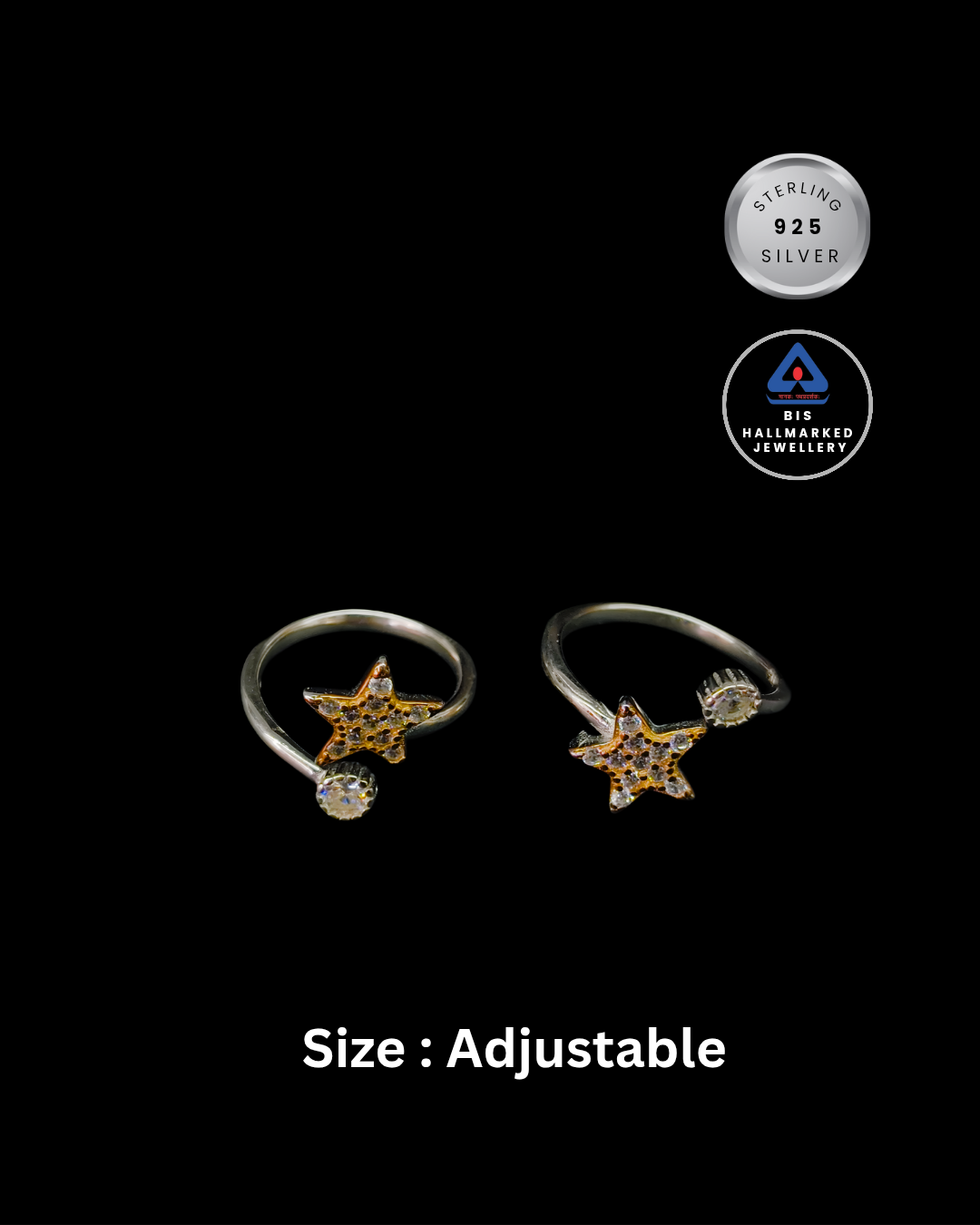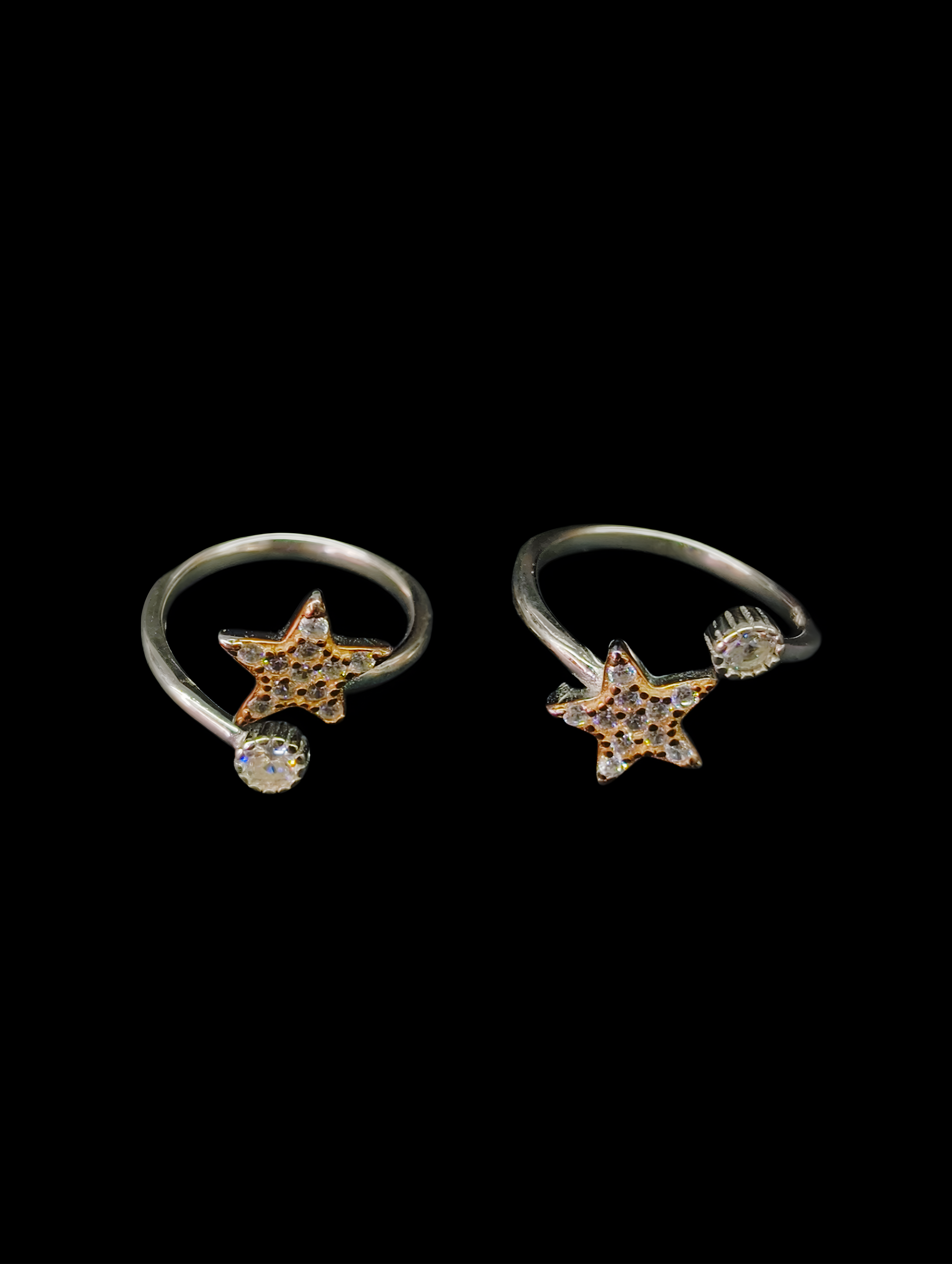 eps with the RUKMI Celestial Star Toe Rings. Each ring in this exquisite pair is expertly fashioned from authentic 92.5 Sterling Silver, ensuring a high-quality, hypoallergenic finish that is perfect for daily wear. The design features a stunning, crystal-encrusted star paired with a brilliant round solitaire stone, creating a "shooting star" effect that radiates elegance.