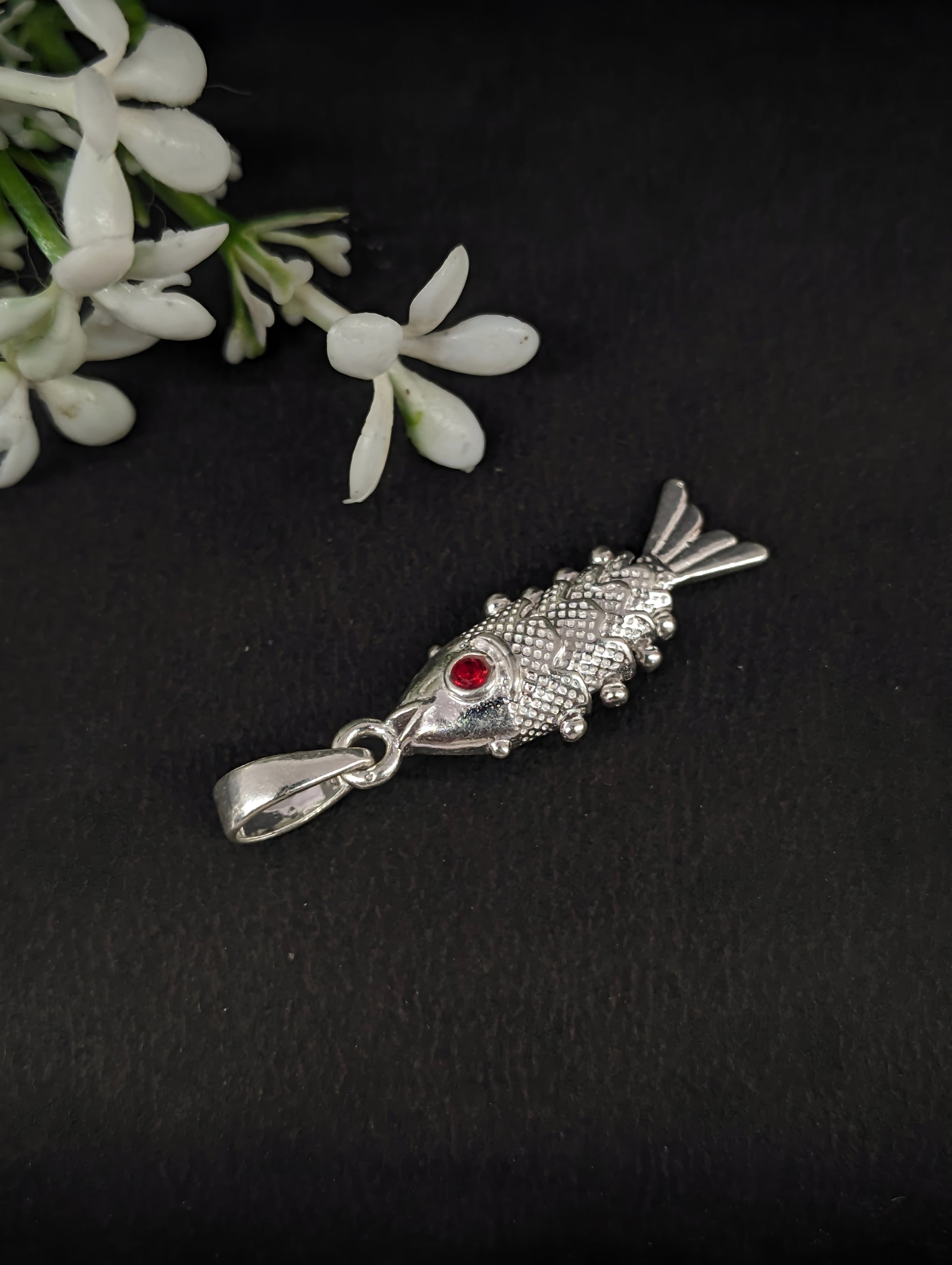 Add a touch of elegance and symbolism to your jewelry collection with this beautifully crafted Silver Fish Pendant featuring a striking red stone eye. Inspired by the graceful koi fish, this pendant represents prosperity, abundance, strength, and positive energy. Designed with intricate detailing and a polished silver-tone finish, it is the perfect accessory for everyday wear or special occasions.
